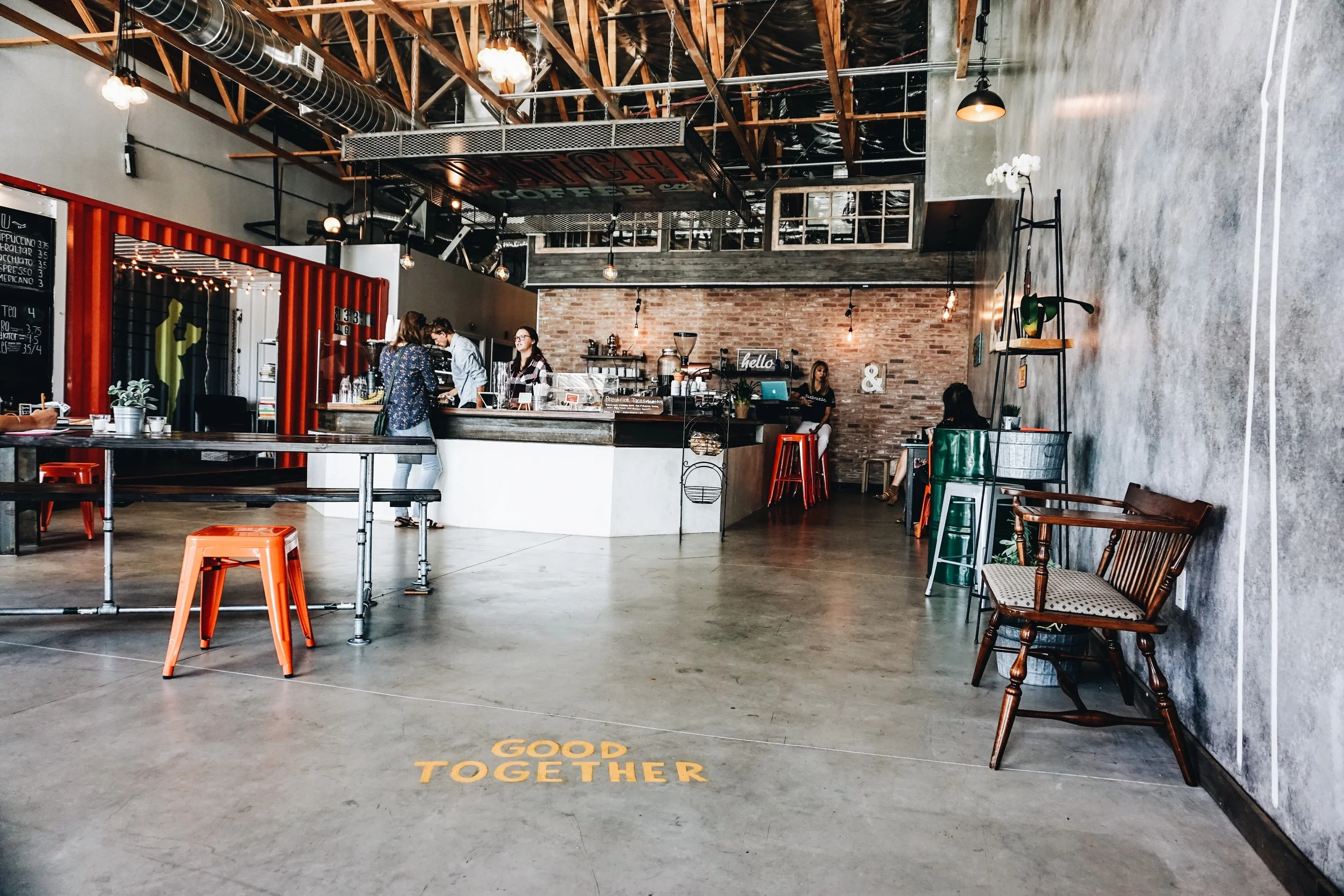 The coffee bar itself acts like a kitchen island, allowing for the barista-customer interaction to be more fluid and you can watch the full process of your coffee being made. To your right and your left and behind the counter you'll find ample seating: Whether it's along the oak tables, the window sills, or even inside the refurbished storage container underneath twinkling lights.